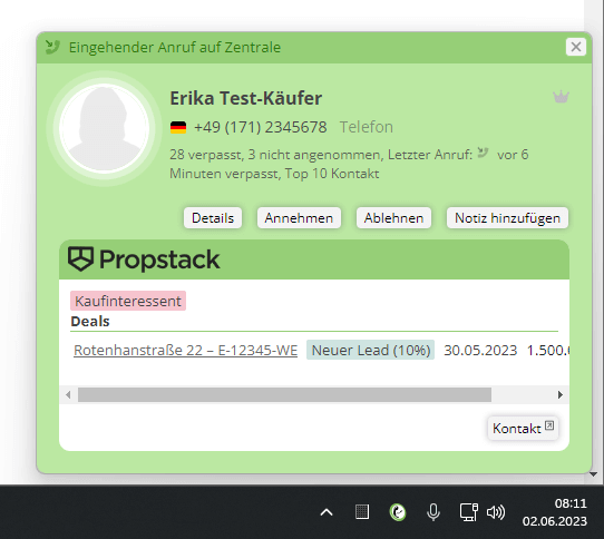 In Propstack selbst wird eine Anrufbenachrichtigung angezeigt (Propstack-interne Funktion).