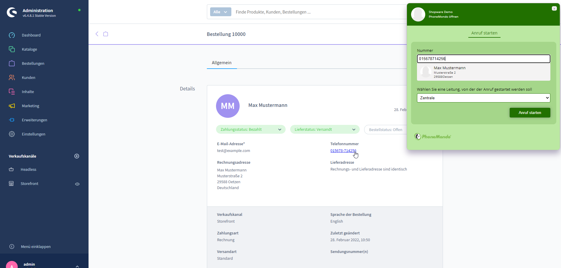 Installieren Sie die PhoneMondo Browsererweiterung, werden Telefonnummern in der Shopware Administration zu Links. Klicken Sie auf die Telefonnummer, können Sie einen Anruf mit diesem Kunden starten.
