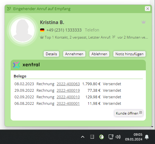 - Anzeige der Kontaktdaten (mit Link zu Xentral Kontakt) aus Xentral beim Klingeln des Telefons