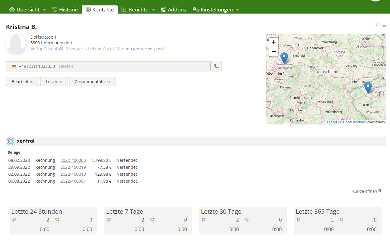 Auch in den Details zu einem Anruf oder Kontakt werden die Kontaktdaten und Belege aus Xentral mit angezeigt.