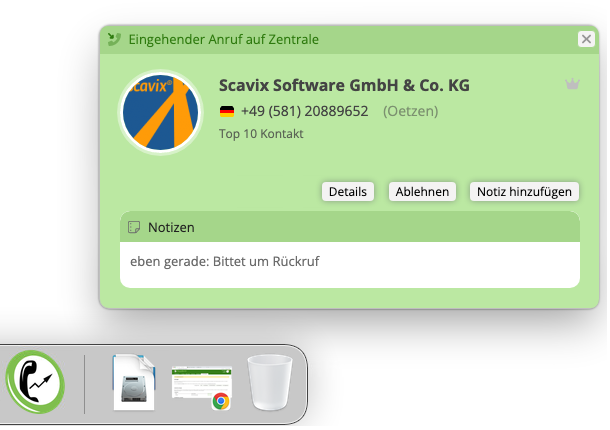 Es werden auch die von Ihnen oder Ihren Kollegen in PhoneMondo zum Kontakt erfassten Notizen gezeigt und Sie können eine neue Notiz direkt im Benachrichtigungsfenster hinzufügen. Haben Sie PhoneMondo mit Ihrem CRM-System wie z.B. Pipedrive, zoho oder Hubspot verbunden, wird diese Notiz auch dort gespeichert.