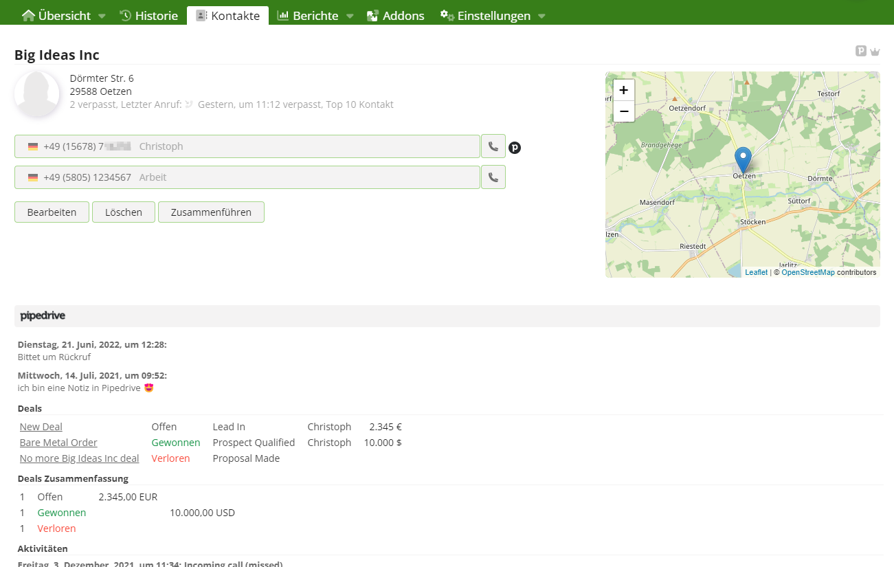 Öffnen Sie die Details eines Kontaktes, werden alle Informationen zu dem Kontakt angezeigt. Diese Seite enthält auch Links zu den Details des Kontaktes in Ihrem CRM-System (z.B. Pipedrive). Ist der Kontakt mit einem Datensatz in Ihrem CRM-System (durch Import) verknüpft, werden auch Daten aus dem CRM-System live dort angezeigt. Wie im Screenshot zu sehen ist können dies z.B. die aktuellen Deals des Kontaktes aus Pipedrive sein.